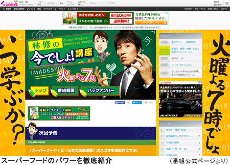 近年、美容や健康が気になる人に「スーパーフード」が注目されています。一般の食品より栄養価が高いチアシード(シソ科チアの種、関連記事=おなかで30倍に膨らむ「バジルシード」「チアシード」に挑戦)やアサイー(ヤシ科アサイーの実)などがそれですが、「林修の今でしょ!講座」(4月19日19:00=テレビ朝日系)では、このスーパーフードについて正しい知識が紹介されます。また、「華大の知りたい!サタデー」(4月23日21:00=BSフジ)ではその一つ、マヌカハニーを中心にハチミツの健康パワーを紹介。 また、「きょうの健康」(4月18日~21日20:30=NHK・Eテレ)では、アルツハイマー型以外の、あまり知られていない認知症について特集される予定です。 このほか、医療事故の原因究明と再発防止を目的に設立されたチーム「医療事故調査委員会(MAIC)」の活躍を描くドラマ「ドクター調査班~医療事故の闇を暴け~」(4月22日20:00=テレビ東京系)がスタートします。