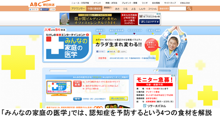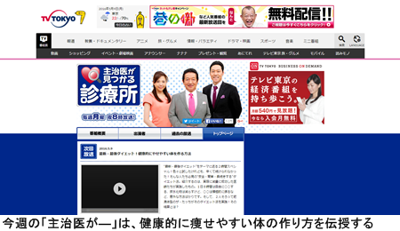 日一日と暑さが増し、薄着になる季節。今のうちにおなかや二の腕のたるみを解消しておきたいという人も多いのでは? そこで「主治医が見つかる診療所」(5月9日21:00=テレビ東京系)では、実際に減量に成功した医師たちが安全・簡単・長続きするダイエット法を紹介。また、「林修の今でしょ!講座」(5月10日19:00=テレビ朝日系)では、ダイエットに最も効果が出る正しいジョギング法が解説されます。 また、「団塊スタイル」(5月13日20:00=NHK Eテレ)では、運動と食の面を考慮したたるみ改善策が紹介されるので、団塊世代ならずとも注目ですね。さらに、「華大の知りたい!サタデー」(5月14日21:00=BSフジ)で紹介される「食べる順番健康法」も気になります。 このほか、「たけしの健康エンターテインメント!みんなの家庭の医学」(5月10日20:00=テレビ朝日系)では、認知症が予防できるという食材が紹介される予定です。