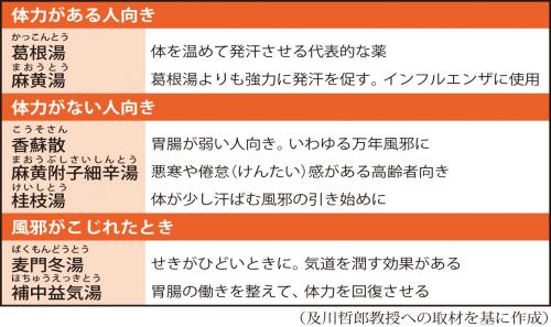 総合感冒薬などの風邪薬は眠気を起こしたりするため服用をちゅうちょする人もいる。そこで副作用が少ないとされる漢方薬を気軽に飲む人もいるが、注意が必要だ。東京医科大学病院総合診療科・漢方医学センターの及川哲郎教授に風邪に効く漢方薬の選び方を聞いた。 ▽30~40種類 風邪症候群(いわゆる風邪)は主にウイルス感染による上気道の急性炎症の総称で、くしゃみ、鼻水、喉の痛み、せき、発熱、頭痛などのさまざまな症状が表れる。 「熱があって頭痛がするときは解熱鎮痛薬、せきが気になるときはせき止め、諸症状には合剤(総合感冒薬)といったように、対症療法的な使い方をする西洋医薬に対して、その人の病気に対する抵抗力、風邪の状態や進行の程度に応じて使い分けるのが漢方薬です」 西洋医薬の多くは副作用で眠くなったり、胃が荒れたりするが、漢方薬は副作用が比較的少ない点が特徴という。 及川教授によると、風邪に処方する漢方薬はエキス製剤だけでも30~40種類ある。代表的な漢方薬には、体力がある人向きの葛根湯(かっこんとう)、麻黄湯(まおうとう)、体力の無い人向きの香蘇散(こうそさん)、麻黄附子細辛湯(まおうぶしさいしんとう)、桂枝湯(けいしとう)、体力に関係なく使える麦門冬湯(ばくもんどうとう)、補中益気湯(ほちゅうえっきとう)などがある。 ▽食前に服用を 例えば、風邪の引き始めで悪寒、頭痛があるようなときには、葛根湯は1~2日服用して治すので短期決戦に強い。風邪がこじれた場合は、体力を回復させる麦門冬湯や補中益気湯の出番だ。 漢方薬には抗ウイルス薬のようにウイルスを直接抑え込む作用は無いが、体を温めることによってウイルスを死滅させる効果がある。インフルエンザに使われる麻黄湯はタミフルやリレンザなどの抗ウイルス薬と比べても遜色ないとの報告もあるという。 薬剤名に「湯」が付く漢方薬はもともと煎じ薬で、フリーズドライされたのがエキス製剤だ。及川教授は「風邪の引き始めで寒けがするようなときはお湯で溶いて飲むとより効果的です。漢方薬は消化・吸収されやすいので食前に服用を」とアドバイスしている。 風邪で漢方薬の処方を希望する場合は日本東洋医学会の漢方専門医のいる漢方内科(https://www.jsom.or.jp/jsom_splist/listTop.do)などに受診を。 (メディカルトリビューン=時事) ◇ ◇ 東京医科大学病院の所在地 〒160―0023東京都新宿区西新宿6の7の1。電話03(3342)6111(代表)