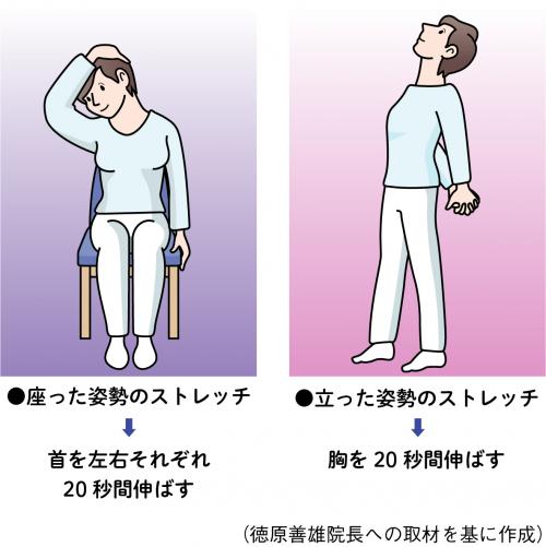 加えて「ストレッチを家でも取り入れ、頻繁に行うことも大事です」。例えば首を左右に20秒ずつ傾けて筋肉を伸ばすストレッチや、立ち姿勢で両手を後ろに合わせて胸を開き、そのまま顔を上げるストレッチもよい。「やり方に決まりはありません。正しい姿勢を保ち、何回か試してみて効果を実感できる、自分に合ったストレッチをどんどん続けてください。大切なのは長時間の前屈姿勢を避けることです」と徳原院長はアドバイスしている。(メディカルトリビューン=時事)