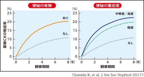 便秘はよくある症状の一つで、軽く見られがちだ。しかし近年、慢性的な便秘は、さまざまな病気のリスクを高めることが分かってきた。寿命を縮めるとの報告もある。便秘が慢性腎臓病(CKD)のリスク因子になる可能性を指摘する、米テネシー大学ヘルスサイエンスセンター腎臓内科の住田圭一准教授にオンラインで話を聞いた。 ▽新たな「国民病」に CKDとは、腎臓の障害または腎機能の低下が3カ月以上続いている状態。高齢化の進行で糖尿病、高血圧症などの生活習慣病が増加していることが背景にある。成人の約8人に1人がCKDと推定され、新たな「国民病」と位置付けられている。 怖いのは、初期に症状がほとんどないため、進行してから気付くことが多いということ。「治療せずに放置すると末期腎不全(腎臓がほとんど機能しなくなった状態)に至り、人工透析、腎臓移植などの腎代替療法が必要になります。CKDは、心臓病や脳卒中などの心血管疾患の発症や進展に関わることも分かっています。ですから腎臓を守ることは、心臓や脳を守ることにつながります」 ▽重症の便秘ほどリスク大 便秘にもなりやすい。住田准教授らは米国に住む約350万人を対象に、便秘の有無・重症度別にCKDの発症や進行具合を調査した。 その結果、便秘があると、CKDの発症リスク、悪化速度を上げるリスク、そして末期腎不全の発症リスクが明らかに高くなることが分かった。その傾向は重症の便秘ほど強かった。 「便秘は、CKDのリスク因子でもある可能性が示されました。腸管に内容物が停滞することによる有害物質の過剰産生、便秘に伴う腸内細菌の乱れなどが、CKDの発症や進展に影響していることが推測されます」 便秘の治療によるCKD発症、進行を予防する研究も進んでいるという。「たかが便秘、されど便秘です。最近は便秘治療薬の開発が急速に進んでいますから、慢性的な便秘でお困りなら、早めに医療機関で相談されることをお勧めします」とアドバイスしている。 〔1〕CDK発症率。便秘があるとCKDの発症リスクは高まり(左)、便秘の重症度が高まるほど発症率も高まる (メディカルトリビューン=時事)