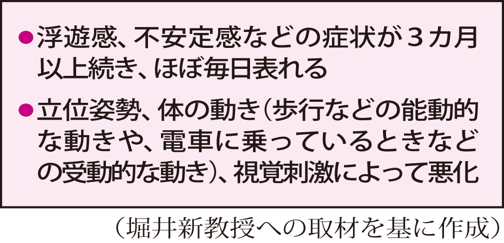 PPPDは、何らかの急なめまい(多くは耳の奥にある内耳の病気によるめまい)が起こり、その病気が治癒した後も、浮遊感、不安定感などが3カ月以上、ほぼ毎日表れる。立位姿勢(立ち上がるなど)、体の動き(歩行などの能動的な動きや、電車に乗っているときなどの受動的な動き)、視覚刺激(大型店の陳列棚を見るなど)により、症状が悪化するのが特徴だ。