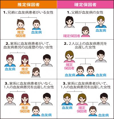 保因者には、推定保因者と確定保因者がある。家系内に血友病患者がいても、血友病の男児を出産していない女性は推定保因者だ。血友病の男児を1人出産していても、家系内に他に血友病患者がいない女性の場合、男児は遺伝ではなく突然変異による血友病などの可能性があり、女性は推定保因者に当たる。一方、血友病の父親を持つ女児や、血友病の男児を2人以上出産した女性は確定保因者になる。