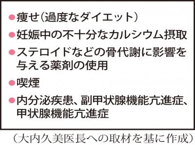 骨に含まれるカルシウムが減少して骨がもろくなる骨粗しょう症は、閉経後の高齢女性に多い。ところが、これと同じ状態が妊娠後期から授乳期でも起こることがあり「妊娠後骨粗しょう症」と呼ばれている。亀田総合病院(千葉県鴨川市)生殖医療科の大内久美医長は「10歳代後半から20歳代にかけて、運動やダイエットで無月経になった経験がある人は注意が必要です」と呼び掛ける。