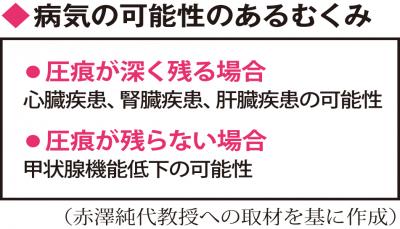 体内に余分な水分がたまる「むくみ」。女性のむくみは女性ホルモンの影響も大きく、ライフステージによって症状は異なる。金沢医科大病院(石川県内灘町)女性総合医療センターの赤澤純代教授にセルフチェック法などを聞いた。 ▽舌でチェック 排卵直後から卵巣で作られる女性ホルモンの一つ、プロゲステロン(黄体ホルモン)は、妊娠に備えて体内に水分を蓄える作用があり、生理前は体がむくみやすい。一過性のものが多いが、「次の月経までの期間は便秘もしやすく、濃い味のものを食べたくなります。塩分を薄めるために体は水分をため込もうとし、むくみの悪循環に陥りやすくなる」。 ホルモンバランスが変わる妊婦や、更年期、閉経後の女性はよりむくみが生じやすいという。 「閉経後は、女性ホルモンの一つ、エストロゲン(卵胞ホルモン)の低下で血管内皮細胞の機能が低下し、血管の老化が起こるとむくみやすくなります」 チェック法としては、舌でのセルフチェックがある。舌を出した際に、歯形がついていればむくみがあるサインだ。 ▽運動や食事で改善 むくみは足や顔、まぶたに出やすい。足は長時間同じ姿勢でいると、むくみやすい。ウオーキングや階段の上り下りをすると、ふくらはぎで滞っている血流が押し上げられ、むくみ解消になる。「デスクワーク中も1時間に1度は立ち上がり、かかとの上げ下ろしをしてください」 むくみ防止に有効な着圧靴下については、「小さ過ぎると逆効果なので、自分のサイズより一つ大きい物を選びましょう。むくみが気になるときは膝裏のつぼを押し、足首から膝の方向に、血液を心臓に戻すイメージで、ふくらはぎが柔らかくなるまでマッサージしてください」。 食生活は日頃から減塩を心掛ける。腎臓疾患がなければ、バナナやアボカドなど余分な塩分を排出する働きがあるカリウムを多く含む食品を積極的に取るのもよい。 むくみの原因が病気かどうかを判断する目安として、足のすねの真ん中を約10秒強く指で圧迫する方法がある。圧痕(くぼみ)が深く残る場合は、心臓や腎臓、肝臓の病気の可能性がある。残らなくても、甲状腺機能低下の可能性はある。赤澤教授は「むくみが続く場合は医療機関を受診しましょう」と助言する。(メディカルトリビューン=時事)