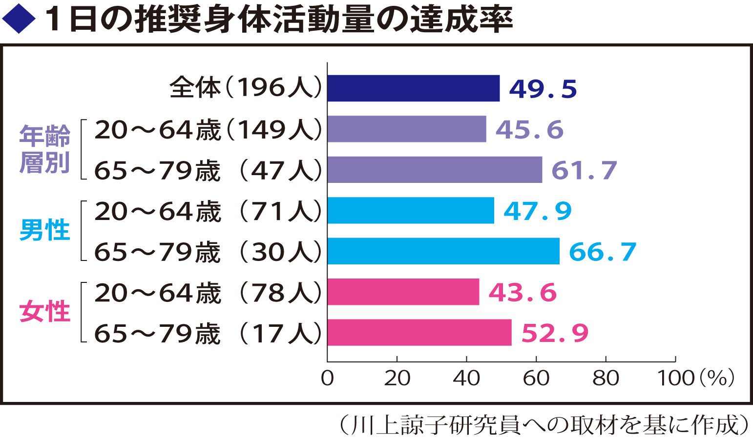 厚生労働省が昨年策定した健康づくりのための「推奨身体活動量」は、成人で1日60分以上(約8000歩以上の歩行)、高齢者で1日40分以上(約6000歩以上の歩行)だ。この基準を達成している人はほぼ半数と考えられることが、明治安田厚生事業団体力医学研究所(東京都八王子市)の川上諒子研究員らによる調査で分かった。 ▽客観的に評価 推奨身体活動量は、これまでの研究成果や日本人の身体活動状況などを考慮して設定されたが、実際に国民が1日にどれくらいの活動をしているのか、十分に把握できていなかった。 そこで、川上研究員らは腰に装着する活動量計を使い、首都・中京・近畿圏で1日の身体活動量を調べ、厚労省基準の達成率を評価。身体活動データを1分ごとに記録することで、「労働、家事、移動など日常生活の中でどのくらい体を動かしているか客観的に評価できます」。 2023年10~11月、三大都市圏の13都府県在住の20~80歳未満の男女650人に活動量計を1週間装着してもらい、生活習慣に関する質問票に回答してもらった。 ▽高齢者の達成率60%超 約3割に当たる196人から得たデータを分析した結果、立ち仕事、家事、ストレッチなどの低強度の活動時間(中央値)は1日5.5時間、階段昇降、子どもと遊ぶ、テニスなどの中高強度の活動時間は1日55.9分だった。1日の歩数は、成人(20~64歳)男性で7349.8歩、女性で6659.4歩、高齢者(65~79歳)は男性で5890.4歩、女性で4917.0歩と、いずれも厚労省の推奨歩数を下回った。 推奨量を達成した人の割合は全体の49.5%。運動を行っている人の達成率は69.1%で、行っていない人(41.8%)より高かった。 「運動を習慣付けてもらうことが大切です。まずはスマホアプリなどを使って、1日の歩数を知ることから始めるとよいでしょう」と川上研究員。同時に、「生活での身体活動を高めるための環境づくり(安全、快適な歩道の整備など)も求められます」と話す。(メディカルトリビューン=時事) ◇ ◇ 明治安田厚生事業団体力医学研究所の所在地 〒192―0001 東京都八王子市戸吹町150 電話042(691)1163