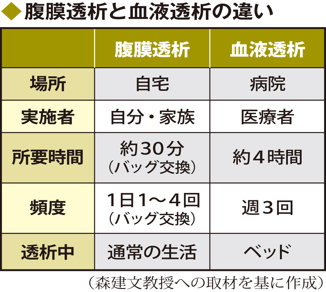 透析は、腎臓の代わりに血液中の過剰な水分や老廃物を取り除く医療。透析器を使って病院で行う血液透析(HD)が有名だが、腹膜透析(PD)という全く別の透析がある。 日本の透析患者のうちPDはわずか3%だが、東北医科薬科大病院(仙台市)腎臓内分泌内科の森建文教授は東日本大震災の経験から、災害に強いとして普及に努めており、「透析液の進歩などでPDの有用性は劇的に高まりました」と話す。 ▽血液透析は医療疎開必要 透析器と大量の水、電気を要するHDは、大規模災害発生時に継続が難しい医療の筆頭に挙げられる。2011年の東日本大震災では医療機関も大きな被害を受け、発生翌日の宮城県内の透析器稼働率は14%だった。当時、東北大病院にいた森教授は、家族の安否確認もままならない透析患者を、関東や北海道の施設に振り分ける仕事に追われた。 このとき目に留まったのが、避難所の片隅で自ら透析をするPD患者の姿。「PDならば透析医療疎開の必要がない。災害時の視点で透析のあり方を見直すべきです」 ▽劇的に進歩 PDでは、HDでは透析器の中の透析膜が担う役割を患者の腹膜が行う。患者や家族が点滴の要領でバッグに入った透析液を腹腔(ふくくう)に入れると、浸透圧などの力で数時間かけて水分や老廃物が透析液に移行する。この古い透析液を腹腔内からバッグに取り出し、新しいものを注入する。 腹部に透析液の出し入れをするためのカテーテルを埋め込む手術が最初に必要になるが、1回30分ほどのバッグ交換を1日数回行うだけで済み、交換時間を除いた透析中は自由に生活できる。1回約4時間、週3回程度の通院が必要なHDと比べはるかに負担が少ない。 半面、PDには▽感染症を起こしやすい▽水分や老廃物を除去する力がHDより弱い▽次第に腹膜が劣化し5~10年しか続けられない―などの問題があった。それが普及を阻んだ理由だが、「最近の進化は著しい」。 紫外線殺菌装置の開発、腹膜への刺激が少ない透析液への移行など、問題点は解消されてきている。森教授はさらに、PDが患者自身による医療行為である意義を強調。「災害時に身を守るのは、自分の体の状態や飲んでいる薬についての知識です。日々、セルフケアを実践するPD患者は、災害時もうろたえずに病に向き合えるはずです」と述べている。(メディカルトリビューン=時事) ◇ ◇ 東北医科薬科大病院の所在地 〒983―8512 仙台市宮城野区福室1丁目12番1号 電話 022(259)1221(代表)