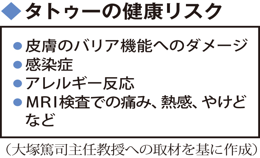 タトゥーは、注射針を皮膚の深い部分(真皮)に刺し、色素(インク)を注入する。皮膚には常在菌によるバリア機能があり、乾燥や外的刺激、紫外線などから生体を防御している。針を刺すことでバリア機能が破壊され、皮膚炎などを引き起こすリスクがあるという。