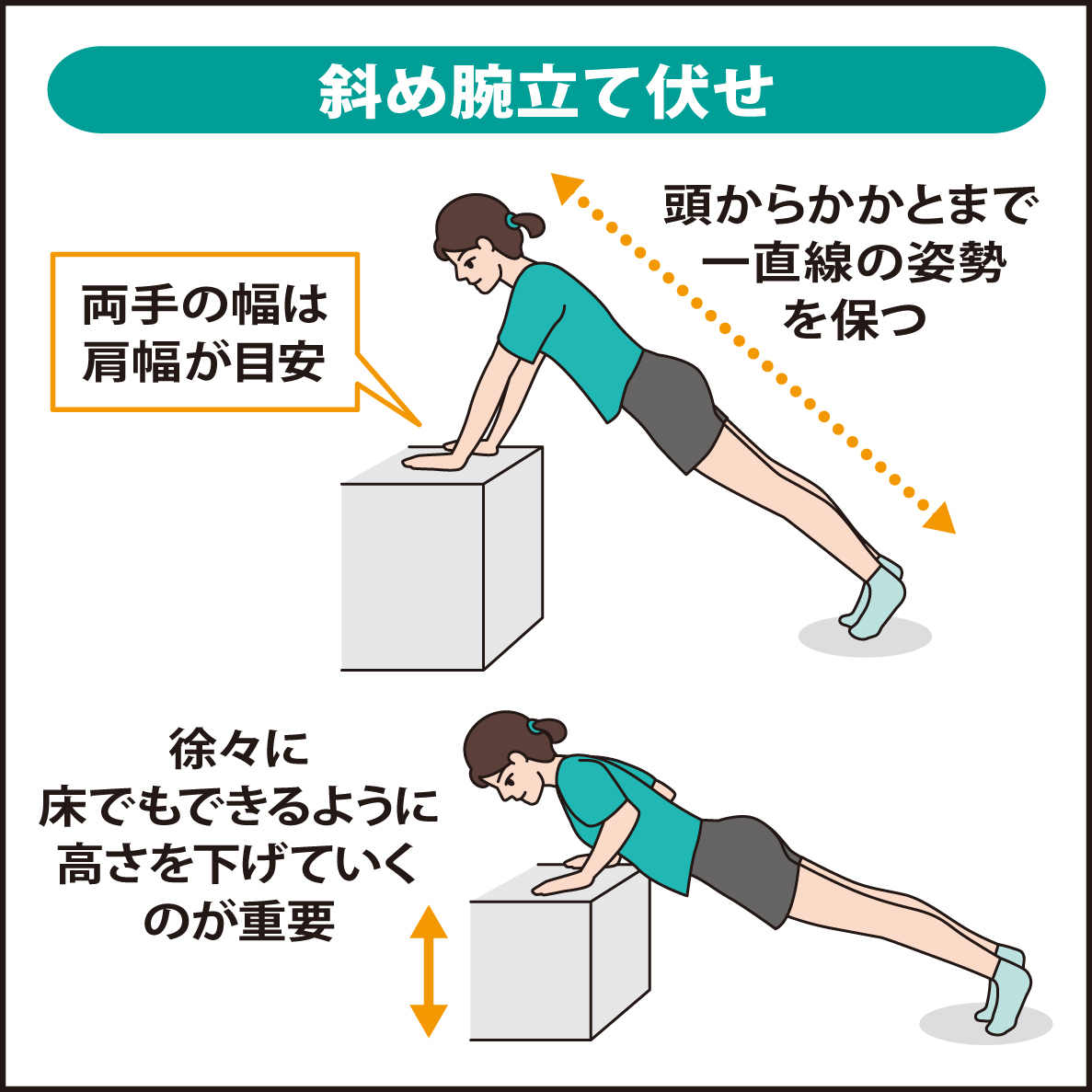 筋トレ初心者にお勧めなのが、机や壁などに手を突いて行う斜め腕立て伏せだ。「自宅の洗面所や台所など、いつでも気軽にできるので、スクワットとセットで1日10回から始めてみましょう」