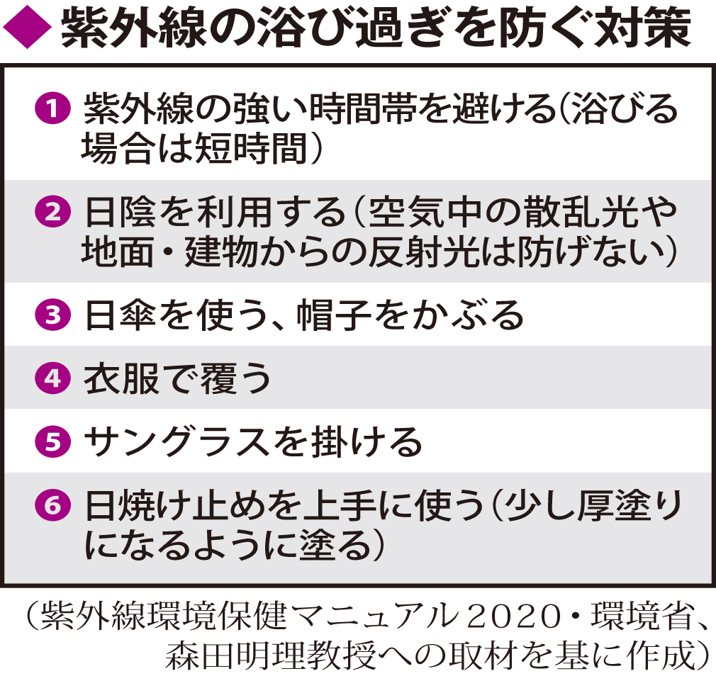 太陽の紫外線を長時間、無防備に浴びていると、肌にしみやしわができる。「光老化」とはこうした光の害による老化現象を指し、長期的に皮膚や眼の健康を害する場合もある。 名古屋市立大病院皮膚科の森田明理教授は「紫外線が皮膚に当たると体に必要なビタミンができる一方、光老化が進みます。紫外線は健康に役立つ面もあるので常に遮るのではなく、浴び過ぎないように上手に対策することが大切」と話す。 ▽しみ、しわの原因に 太陽光線は、紫外線(UV)、可視光線、赤外線の三つに分かれる。このうち、光老化に最も大きく影響するのが紫外線だ。また、可視光線の一部であるブルーライトや近赤外線も光老化に関係している。 紫外線は波長が長いほど皮膚の奥まで届く。長波長紫外線(UVA)と中波長紫外線(UVB)は地表に到達し、UVBは表皮まで、UVAはその奥の真皮まで入り込む。 皮膚には太陽光線を防御する仕組みが備わっている。中でも強力なのが、紫外線を吸収するメラニン色素だ。森田教授は「UVBが当たると、皮膚の色素細胞がメラニン色素を作り、周囲の表皮細胞に運んで肌を守ろうとします。日焼けを繰り返すと大量に作られたメラニンが表皮にたまり、しみができます」と説明する。「UVAや近赤外線を浴び続けると真皮の膠原(こうげん)線維(コラーゲン)を分解する物質などが作られ、肌の弾力やみずみずしさを失わせる。皮膚を保つ力が弱くなり、しわやたるみができるのです」 ▽赤くなる日焼け注意 皮膚にUVBが当たると、カルシウムの吸収を助けるビタミンDが体内で合成される。ビタミンDが不足している人が多いとの報告もあり、日光を避け過ぎるのも問題だ。季節・地域などにより異なるものの、正午前後なら顔や腕に5分~数十分程度、紫外線を浴びることで1日のビタミンDの必要量を満たすと推計されている。 一方、長年にわたり紫外線を多く浴びた場合、皮膚がんや白内障などを発症する可能性もある。「皮膚がんリスクは、生涯に浴びる総紫外線量が多いほど増加します。無防備に紫外線を浴びて、肌が赤くなるような日焼けをしないように注意が必要です」 紫外線対策は、日傘や帽子、サングラスなどを使用する。日常的に日焼け止めを使うのもよい。「肌の光老化を防ぎ、見た目の美しさを保つことも長寿社会の活力につながります」 国内の紫外線量は、長期的に増加傾向にある。森田教授は「日常生活では紫外線を長時間浴びないように注意し、屋外のレジャーや運動ではしっかりと紫外線対策をしましょう」と助言している。(メディカルトリビューン=時事) ◇ ◇ 名古屋市立大病院の所在地 〒467―8602 名古屋市瑞穂区瑞穂町川澄1番地 電話052(851)5511(代表)