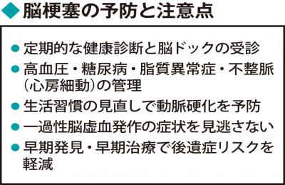 自覚症状がない「隠れ脳梗塞」と、脳梗塞の前触れ発作といわれる「一過性脳虚血発作(TIA)」。どちらも早期治療で脳梗塞が防げる可能性がある。森山記念病院(東京都江戸川区)脳卒中センターの朝来野佳三センター長に聞いた。 ▽後遺症リスク抑える 脳梗塞は、脳の血管が詰まり血流が途絶えることで脳細胞が死んでしまい、手足のまひや言語障害などが表れる病態。原因は大きく分けて、〔1〕動脈硬化により血管が狭まり、血栓ができて血流が遮断される〔2〕心房細動に代表される不整脈によりできた血栓が脳の血管を詰まらせる―の二つがある。 「代表的な症状として、片方の手足のまひやしびれ、ろれつが回らない、言葉が出てこないなどが挙げられます」と朝来野センター長は説明する。 治療法は、血栓を溶かす薬剤を点滴する血栓溶解療法と、カテーテルを血管内に入れ詰まった血栓を取り除く血管内治療(脳血栓回収術)がある。「血栓溶解療法は発症後4.5時間以内、血管内治療は6時間以内(場合によっては24時間以内)に開始することで、後遺症リスクが抑えられる可能性があります」 こうした脳梗塞の発作が起きる前に、隠れ脳梗塞やTIAの段階で経口薬などによる早期治療が行えれば、後遺症リスクはさらに抑えられる可能性が高い。 ▽症状あれば救急車を 隠れ脳梗塞は「無症候性脳梗塞」と呼ばれる。「自覚症状がなく、脳ドックを受けたり、頭痛などで受診したりして磁気共鳴画像(MRI)検査により発見されるケースがほとんど」。精密検査で原因を特定し、治療が行われるのが一般的だ。 一方、TIAは「一時的に血管が詰まり、脳梗塞と同じ症状が表れますが、10~20分程度で消えてしまうため、疲れや体調不良と誤認されがちです。中でも、首の太い血管が狭くなり、ここに血栓が詰まると、一時的に片方の目の視界が暗くなります(一過性黒内障)。この場合、後に重大な脳梗塞が起きる可能性が高いので要注意です」。 TIAの段階でもためらわず救急車を呼び、すぐに救急外来か脳神経外科を受診すること。「高血圧、糖尿病、脂質異常症、不整脈(心房細動)は脳梗塞のリスクになります。健康診断などで見つかったら、生活習慣を見直したり適切な治療を受けたりして、脳梗塞予防を心掛けましょう」と、朝来野センター長はアドバイスしている。(メディカルトリビューン=時事) ◇ ◇ 森山記念病院の所在地 〒134―0081 東京都江戸川区北葛西4の3の1 電話03(5679)1211(救急診療)