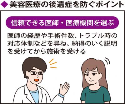 近年、女性を中心にニーズが高まっている美容医療。合併症や後遺症に悩むケースも増えている。日本医科大付属病院(東京都文京区)で美容後遺症外来を担当する朝日林太郎医師は「ここ数年で受診患者数が増えています」と話す。 ▽十分な説明を受けて 美容医療による後遺症が増加する背景として、トラブルが起きた際の医師の対応力不足があるという。臨床研修を終了後、保険診療科を経験せず美容医療に進む若手医師が増える中、「合併症の知識や、手術の経験、技術が乏しい医師に、緊急時の適切な対応は難しい。対応の遅れが後遺症につながるケースも多い」。 相談内容も多様化している。「しわやたるみを改善する治療としてヒアルロン酸やボトックス注射、糸リフトなど『切らない治療』が人気です。手軽で安全性も高いと思われがちですが、後遺症が少ないとは限りません」。ヒアルロン酸注入の重大な副作用の一つが塞栓だ。「非常にまれですが、ヒアルロン酸が血管内に注入されて血管が詰まると、皮膚の広い範囲の壊死(えし)や失明に至ることもあります」 出血や重篤な感染症、窒息などにより死に至る可能性もゼロではない。「合併症や後遺症が起きた時に、どんな対応を取ってもらえるのか、必ず事前に医師の説明を受け、納得できなければ利用を控えることも大切です」 ▽誰に受けるかが肝心 施術を受ける前に後遺症などのリスクについて、医師から説明がなかったと話す人もいる。最近は海外で、ファッション感覚で美容手術を受ける人も増えているが「後遺症が出た場合、治療を受けられる医療機関が見つからないなど、新たな問題が生じています」 後遺症治療は施術を受けた施設で受けるのが基本。自費診療のため「美容医療はどこで、誰に受けるかがトラブル予防には重要です」 信頼できる医療機関を探すには、医師の卒業大学や年次などの経歴、手術件数などを公表しているか、治療のメリット・デメリットの両方を説明しているか、トラブルが起きた際に相談できる体制かどうかもポイントだという。 「美容医療を受ける際は、治療に伴うリスクを医師と共有した上で、アフターケアを含め慎重に選択しましょう。それでも後遺症が出てしまったら、一人で悩まず、大学病院など後遺症治療に対応する医療機関にご相談ください」と朝日医師は助言する。(メディカルトリビューン=時事) ◇ ◇ 日本医科大付属病院の所在地 〒113―8603 東京都文京区千駄木1の1の5 電話03(3822)2131(代)