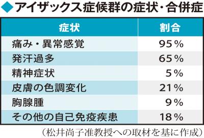 手足などの筋肉が勝手にピクピクと動いたり、焼け付くような感覚や強い痛みが続いたりするなどの症状が出る「アイザックス症候群」。国の指定難病の一つで、これまで不明な点が多かった。徳島大大学院臨床神経科学の松井尚子准教授らは、患者数、有病率、症状、治療内容などについて初めて全国的な調査を行った。