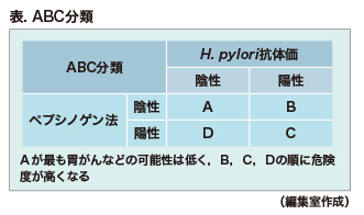ABC分類では,Helicobacter pyloriHP)血清抗体検査とペプシノゲン(PG)法を組み合わせて胃がんリスクを判定する()。簡便なスクリーニング法として,対策型検診や任意型(人間ドック)検診に導入が進んでいる。第56回日本人間ドック学会学術大会(7月30~31日,会長=医療法人社団相和会理事長・土屋敦氏)のパネルディスカッション「ABC分類によって,今後の任意型(人間ドック健診)胃検診は変わっていくのか」では,各施設における実施状況や課題が示され,それぞれの立場からの見解が報告された。
