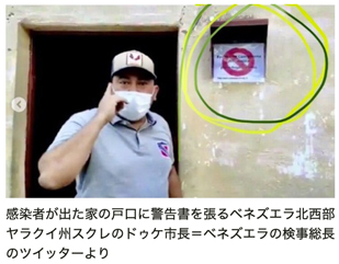 【サンパウロ時事】南米ベネズエラ北西部ヤラクイ州スクレの市長が、新型コロナウイルス感染者が居る家は「訪問お断り」の紙を張るよう命じ、論議を巻き起こしている。検事総長は7日、国の新型コロナ対策や指針に反しているとして捜査を命じるとともに、取り除くよう求めることを明らかにした。 フェイスブック、コロナ偽情報でベネズエラ大統領のページ凍結※こちらのリンクはただいま無効中です。 地元報道によると、スクレのドゥケ市長は6日、インターネット交流サイト(SNS)に、感染者や感染が疑われる家族がいる家の戸口に赤い「通行止め」のマークをあしらった「隔離措置中の家庭。訪問はお断り」と書かれた紙を張る様子を投稿。市長は「市民を守るためだ」と主張した上で、剥がした者には1度目は罰金を科し、2度目はガスや食料配給を止めるなどと警告した。 この措置について、ネット上で「自分の家に張られたらどう思うか」「予防措置には同意するが、人権侵害」などと非難が上がる一方、「地域に注意を呼び掛けただけ。問題が収まるまでは仕方ない」などと擁護する声もある (2021年4月9日 時事メディカル)