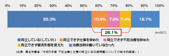 厚生労働省雇用環境・均等局雇用機会均等課は4月3日、不妊治療と仕事の両立の支援を目的とした、職場の上司・同僚向けサポートハンドブックおよび、事業主・人事部門向けマニュアルを作成。公式サイトに掲出した。(関連記事「どうする?女性外科医の不妊治療」「オーバードーズ防止に向け、小中高生向けの周知資材を作成」) 4人に1人以上が「両立できない」 結婚や出産の高齢化が進んだ日本では、働きながら不妊治療を受ける労働者が増加傾向にある。厚労省の調査によると、夫婦のうち不妊を心配したことがある割合は39.2%、実際に不妊の検査や治療を受けたことがある(現在受けている)のは22.7%と、年々増加しており(図1)、2022年の全出生児に占める生殖補助医療による出生児の割合は10%(7万7,206人)に上った。 図1.不妊の検査や治療を受けたことがある夫婦の割合 こうした背景の下、2021年2月に次世代育成支援対策推進法に基づく行動計画策定指針が改正され、一般事業主行動計画に盛り込むことが望ましい事項として「不妊治療を受ける労働者に配慮した措置の実施」が追加された。2022年4月には不妊治療と仕事との両立に取り組む優良な企業に対する新たな認定制度が創設され、不妊治療の保険適用が始まるなど国の支援も進んでいる。 一方で、不妊治療をしたことがある(予定している)労働者のうち、26.1%が仕事との両立ができなかった(できない)との調査結果もある(図2)。 図2.不妊治療と仕事の両立状況 両立が困難な理由として、①治療にかかる時間が読めない、②通院日に外せない仕事が入るなど仕事との日程調整が難しい、③精神面での負担が大きい-ことなどが挙げられている。 こうした状況に鑑み、厚労省は「不妊治療を受けやすい休暇制度等環境整備推進事業」の一環として、職場の上司・同僚向けの「不妊治療と仕事との両立サポートハンドブック」(図3)を作成。事業主・人事部門向けの「不妊治療を受けながら働き続けられる職場づくりのためのマニュアル」(図4)についても、最新の情報に基づき改定し、各企業において不妊治療に対する理解と周知、および仕事との両立に向けた支援・取り組みを進めるよう求めている。 図3.「不妊治療と仕事との両立サポートハンドブック」 図4.「不妊治療を受けながら働き続けられる職場づくりのためのマニュアル」 (図1~4とも厚生労働省発表資料) (編集部・小暮秀和)