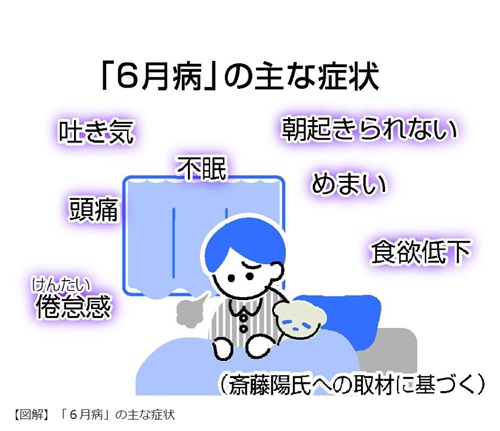 6月病は「5月病」と同様、心身の不調を表す総称で、医学的には適応障害に分類される。主な症状としては、朝起きられないことに加え、不眠や頭痛、腹痛、めまい、吐き気、倦怠(けんたい)感、食欲低下などが続くのが特徴という。
