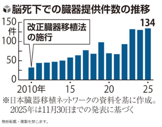 2025年の脳死下での臓器提供が11月30日で134件となり、年間で過去最多となったことが、日本臓器移植ネットワーク(JOT)への取材で分かった。臓器移植についての国民の理解や脳死判定を行う医療機関への国による財政支援が進んだことなどが背景にあるとみられる。海外との比較では、依然として低水準にとどまっており、増加に向けたさらなる取り組みが求められている。 JOTは29日、福岡市立こども病院に入院していた6歳未満の女児が、今年133件目となる改正臓器移植法に基づく脳死と判定されたと発表した。23年の132件を上回り、過去最多を更新した。30日には、18歳未満の男子が脳死判定され、134件となった。 脳死となった人からの臓器移植を可能とした臓器移植法が1997年に施行された当初は、本人の意思表示などが必要で、年間の提供件数は数件にとどまっていた。2010年に家族の承諾だけでの提供を可能とする改正法が施行され、増加傾向が続いていた。 厚生労働省は、臓器提供の経験が豊富な医療機関から、経験の浅い医療機関に医師らを派遣する事業や臓器提供への診療報酬の加算などを進めてきた。 ただし、24年の人口100万人あたりの臓器提供件数は1・13人で、 米国の49・70人や韓国の7・75人より大幅に低いのが現状だ。 日本移植学会理事長の小野稔・東京大教授は「命が救われる移植医療の意義が浸透してきた。自分や身内が脳死になった時に、『貢献したい』という思いがさらに広がれば」と話す。 (2025年12月1日 読売新聞)