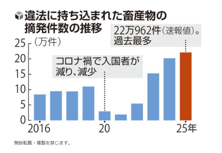 ウイルスが付着した肉製品などの畜産物が国外から持ち込まれる恐れもある。家畜伝染病予防法は畜産物の個人による持ち込みを原則禁じている。農水省によると、昨年の違法持ち込みの摘発件数は、22万962件(速報値)。記録が残る16年以降最多で、侵入リスクが高まっている。