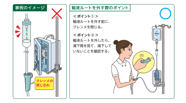 同機構は、輸液ルートをポンプから外す際のポイントとして、①輸液ルートを外す前に必ずクレンメを閉じる、②輸液ルートを外した後に滴下筒を目視し、薬液が滴下していないかを確認する-ことを示しつつ、自施設に合った取り組みの検討を求めている(図)。