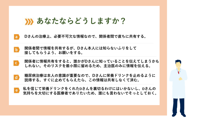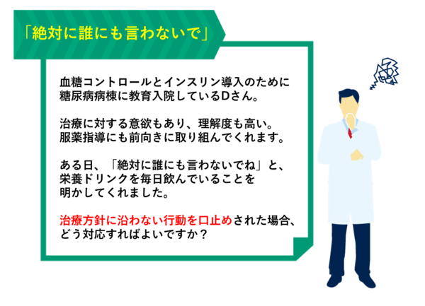シップヘルスケアファーマシー東日本株式会社川村 和美 患者さんの望みに応えるか、医師の指示に従うべきか...。どのように判断したら適切なのだろうとモヤモヤしたことはありませんか? とりわけ、"倫理的判断"に迷う場面においては、直感に基づく判断をせず、そのケースをさまざまな側面から幅広く検討し、より望ましい決定をするというプロセスが重要になります。 さて、今回は「治療とは関係のない長い話をする患者さん」のケースです。薬剤師として、どのように対応すればよいでしょうか。 このケースの詳しい状況説明や、薬剤師が倫理的に判断するために必要な5つの視点からの解説はこちらに掲載しています。※(関連記事)『絶対に誰にも言わないで』 それぞれの対応は望ましい? このケースを考える上で大切な、5つの視点から解説していきます。※(関連記事)倫理的に判断するための5つの視点とは? <img alt="a.JPG" src="https://asset.mtweb.jp/rensai/filesknowhow/diagnosis-judgement/a.jpg " width="33" height="32" class="mt-image-left" style="float: left; margin: 0 20px 20px 0;">Dさんの治療上、必要不可欠な情報なので、関係者間で直ちに共有する。 この方法は、患者の視点、状況の視点、QOLの視点が不足しています。Dさんなりに、長年の食事制限による栄養の偏りを気にして、栄養ドリンクを継続的に摂取しているとか、糖尿病になる前からずっと摂取してきたといった理由があるのかもしれません。守秘義務違反という法的問題を考えても、関係者間で情報を共有する前に、栄養ドリンクを継続的に摂取している理由を聞く必要があるでしょう。 <img alt="b.JPG" src="https://asset.mtweb.jp/rensai/filesknowhow/diagnosis-judgement/b.jpg " width="35" height="31" class="mt-image-left" style="float: left; margin: 0 20px 20px 0;">関係者間で情報を共有するが、Dさん本人には知られないように接してもらう この方法は、関係者の視点、状況の視点、QOLの視点が欠けています。Dさん本人には知られないように接してほしいと依頼した場合、それぞれの関係者はどう感じるでしょうか? 皆が同じように、本人には知らせてはいけないと考えてくれるとは限りません。もしも、他の医療者がDさんに栄養ドリンクの摂取を注意するようなことがあれば、あなたへの信頼は失墜するでしょう。信用できない医療者に囲まれ、猜疑心に苛まれたDさんの入院生活は、心地よいものではなくなってしまう可能性もあります。 <img alt="c.JPG" src="https://asset.mtweb.jp/rensai/filesknowhow/diagnosis-judgement/c.jpg " width="38" height="32" class="mt-image-left" style="float: left; margin: 0 20px 20px 0;">関係者に安易な情報共有をすると、誰かがDさんに言ってしまうかもしれない。そのリスクを最小限に留めるため、主治医にのみ情報を伝える。 この方法も本質的にはbと同様です。関係者の視点、状況の視点、QOLの視点が不足しています。主治医がDさんを咎めたり、注意するようなことがあれば、あなたへの信頼は損なわれ、同じ問題が生じるでしょう。さらに、情報を隠された看護師や他の職種は、決していい気持ちにはならないでしょうし、あなたへの信頼が揺らぐかもしれません。他者の生命を預かる医療において、隠す情報や隠す相手が多いほど、リスクが高まるということを忘れてはなりません。 <img alt="d.JPG" src="https://asset.mtweb.jp/rensai/filesknowhow/diagnosis-judgement/d.jpg " width="34" height="31" class="mt-image-left" style="float: left; margin: 0 20px 20px 0;">糖尿病治療は本人の意識が何よりも重要なので、Dさんに栄養ドリンクを止めるよう説得する。すぐに止めてもらえたら、この情報を共有しなくても済む。 この方法は、薬学的な視点、関係者の視点、状況の視点が不十分です。 Dさんのように強い摂取の希望がある場合、糖類ゼロの商品やビタミン剤などを代替にオススメするとよいかもしれません。 また、すぐに栄養ドリンクの摂取を止めたとしても、治療上、これまで毎日摂取していたという情報は欠かせません。主治医にしてみれば、血糖コントロールが突然安定したり、インスリンの投与量を減らさなければならなくなった場合、その理由がわかりません。主治医の正しい判断を支援するためにも、正確な情報は必要不可欠です。 <img alt="e.JPG" src="https://asset.mtweb.jp/rensai/filesknowhow/diagnosis-judgement/e.jpg " width="33" height="31" class="mt-image-left" style="float: left; margin: 0 20px 20px 0;">Dさんを裏切るわけにはいかないし、Dさんの気持ちを大切にしたいので、誰にも言わないでそっとしておく。 この方法は、患者さんの視点以外、すべての視点が欠落しています。糖尿病の治療上、急激な血糖上昇の可能性が危惧される栄養ドリンクの継続摂取を知りながら、何も介入しないというのは、医療者として適切ではありません。知りながら黙っていたことが分かれば、主治医や担当看護師のみならず、協働する医療者にもネガティブな印象を与えるでしょう。黙認の結果、Dさんの血糖コントロールが悪化したり、合併症を起こした場合、法的に問われる可能性もあります。 望まれる対応は? 