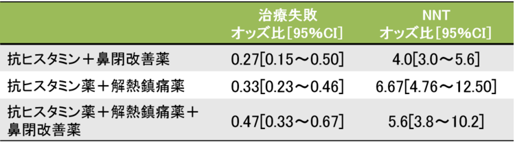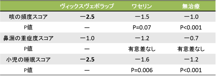 総合感冒薬の効果って正直どんなもん? 総合感冒薬は、実際のところ、どのくらい効くものなのでしょうか。総合感冒薬の有効性について検討した27研究のレビュー3)によると、抗ヒスタミン薬と鼻閉改善薬(プソイドエフェドリンやフェニレフリン)の併用で、全般的症状改善が73%多いという結果になっています(表2)。ただし、有害事象は1.5倍多い傾向にありました(オッズ比1.58[95%CI 0.78~3.21])。 表2 総合感冒薬の有効性 <div style=" clear: both; margin: 15px 10px; font-size: 81.25%; line-height: 1.5; text-align: right;"> 参考文献3より筆者作成 表2を見ると、なんとなくかぜに効果がありそうですが、大事なのはどんな成分が入っていようがあまり効果に差がないという点です。強いて言えば、抗ヒスタミン薬と鼻閉改善薬の組み合わせが一番効きそうですが、解熱鎮痛薬は入っていようがいまいが、あまり有効性に関係なさそうです。もう1点、この報告は成人のデータで、小児における有効性の根拠は乏しいと結論されており、本ケースにそのまま当てはめることは難しそうです。 かぜに対する抗ヒスタミン薬は、鼻症状の改善効果が期待できそうな気もしますが、18研究のメタ解析によれば、その効果は1~2日程度の短期的なものであることが示されています4)。また、熱性痙攣の既往がある小児では、抗ヒスタミン薬が痙攣を誘発させる可能性5,6)もあり、クロルフェニラミンが含有されている総合感冒薬を販売する際には注意が必要です。 アセトアミノフェンは、解熱作用や発熱による違和感の改善効果が期待できるかもしれませんが、咽頭痛に対する効果はあまり明確ではありません7)。アセトアミノフェンは成人を対象とした一部の観察研究で、死亡リスクの増加も報告8)されており、僕らが思うほど安全な薬剤ではない可能性があります。 総合感冒薬は有効性だけでなく、その有害性にも目を向ける必要があります。米国の救急診療受診データの解析9)によれば、12歳以下の小児において、咳止めやかぜ薬による有害事象のために救急診療部を受診している人は年間で7,091人にも上り、この年代における薬物有害事象全体の5.7%に当たると報告されています。 米国では2007年10月より2歳未満への咳止め・かぜ薬の使用は自主規制10)がなされましたが、その前後で、2歳未満の咳止め・かぜ薬関連有害事象による受診は半減したと報告されています11)。 国内においては、厚生労働省医薬食品局が発出している医薬品・医療機器等安全性情報12)によれば、2007~11年度の5年間に製造販売業者から報告された一般用医薬品の副作用報告数は計1,220例であり、総合感冒薬は404例でした。このうち死亡例は12例、後遺症が残った症例は8例と報告されています。 【結局のところどうしますか?】 総合感冒薬にはかぜの重症化を予防したり、死亡リスクを減らすようなインパクトのある効果は期待できません。控えめにいっても、飲まない場合に比べて少しだけ、ほんの少しだけ早く症状が緩和されるかどうか、という感じです。それも小児ではやや根拠に乏しく、たとえ成人であっても、プラセボと比較して症状の平均罹病期間に明確な差がないという報告もあります13,14)。そもそもかぜは自然治癒でも軽快する疾患であり、薬の必要性はそれほど高くはありません。 とはいえ、「総合感冒薬には副作用があるので、あまりおススメできません。しっかり睡眠、しっかり栄養が大事です」なんて言ったらお客さんもがっかりでしょう。お客さんの関心は「薬を子供に服薬させること」にあるからこそ、来店しているのです これまで使っていた薬があるのであれば、それを販売してもよいと思います。どれを選でも有効性は大差ないわけですから、これまで使っていて、患者さんの満足度も高ければ、それはそれでよいのです。 ただ、熱性痙攣の既往歴やインフルエンザの可能性が高いなど、販売した総合感冒薬で有害事象リスクの増加が懸念される場合には、きちんと説明した上で販売を控えるべきでしょう。 侮れないヴィックスヴェポラップの効果 「副作用が怖いので、他に安全な薬はありますか?」と聞かれたら、ヴィックスヴェポラップという選択肢もあります。実はヴィックスヴェポラップ、小児の風邪に対する有効性を検討したランダム化比較試験が報告されているのです15)。 この研究は上気道感染症状を有する 2~11歳の小児144人を対象にしたもので胸部および首周辺に、ヴィックスヴェポラップを塗布する群(44人)、ワセリンを塗布する群(47人)、無治療(47人)の3群を比較してかぜの症状を比較検討したものです。 夜間の咳の頻度と重症度、鼻閉と鼻漏の重症度、小児および親の睡眠状況が、スコア(点数)で評価されました。なお、スコアは 1~7ポイントで、高いほど症状が重いことを示しています。主な結果を(表3)にまとめます。鼻症状の改善はあまり期待できなさそうですが、咳に関しては一定の効果がありそうです。また睡眠スコアを改善している点も大きなポイント