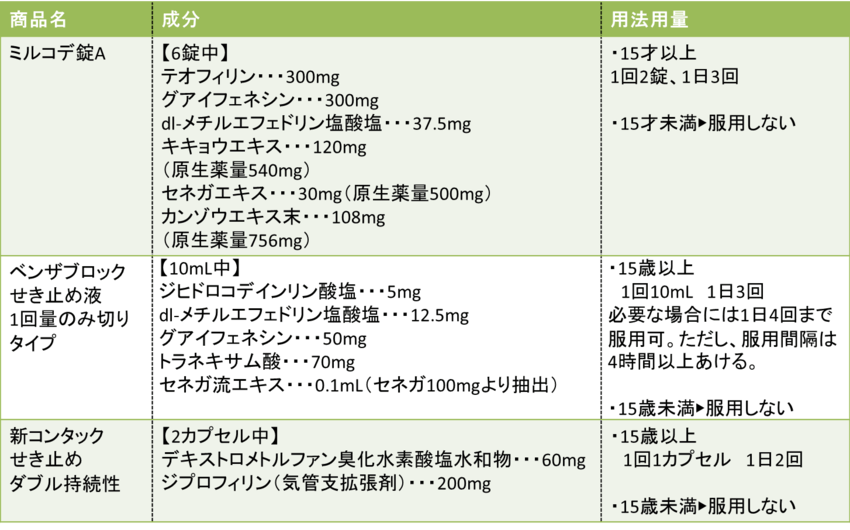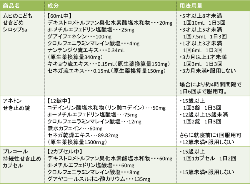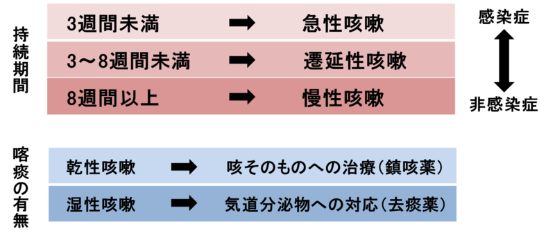 お昼の休憩時間の終わりが迫り、午後も気合いを入れていこうと、栄養ドリンクを飲んだ薬剤師のあなた。そこに、1週間ほど前にかぜ薬を購入した男性客が現れました。 『あのぅ、おかげさまで、かぜの症状はもうだいぶ良いのですが、咳だけが続いてしまって...。ちょっとつらいんです。どんな咳止めがイイですか?』 急性上気道炎における咽頭炎、鼻漏、咳嗽、倦怠感などのいわゆるかぜ症状は、1〜3日でピークに達し、自然経過にて治癒しうるものです。しかし、時に7〜10日ほど、場合によっては3週間ほど症状が持続することもあります1)。経験的にも、かぜをひいた後に咳嗽だけが残ってしまうケースはわりと多いように思います。 日本呼吸器学会の『咳嗽に関するガイドライン第2版』2)では、咳嗽を『持続期間』と、『喀痰の有無』によって分類しています(図1)。 図1 咳の分類 参考文献2より筆者作成 持続期間については、3週間未満を急性咳嗽、3 週間以上~8 週間未満を遷延性咳嗽、8 週間以上を慢性咳嗽と分類しています。急性咳嗽の原因としては、やはり急性上気道炎と、感染後咳嗽が多くを占め、遷延性咳嗽でも感染後咳嗽の占める比率が高い一方、慢性咳嗽では非感染症〔喘息、慢性閉塞性肺疾患(COPD)、アレルギー、胃食道逆流症など〕が主体となります3~6)。 また喀痰の有無では、喀痰を伴わない、もしくは少量の粘液性喀痰のみを伴う乾性咳嗽と、咳嗽のたびに喀痰を伴い、その喀痰を喀出するために生じる湿性咳嗽に分類されます。乾性咳嗽の治療対象が咳嗽そのもので、鎮咳薬を考慮するのに対し、湿性咳嗽の治療対象は気道の過分泌の減少であり、これには主に去痰薬を考慮します。 今回のケースでは、上気道感染症の発症後7日ほど持続している咳嗽症状で、喀痰はほとんどないので、基本的には急性の乾性咳嗽に対する治療薬、すなわち鎮咳薬を中心に考えていけばよいでしょう。 だがしかし、それは本当にかぜによる咳なのか? 直近にかぜの既往があり、急性の乾性咳嗽であれば、その原因はかぜに起因するものと考えてよいと思います。ただし、咳の症状が長期化している、喀痰の症状もある、いつもとなんとなく違うかぜの症状だ、というような訴えがあったら、患者さんの年齢や喫煙などの有無、他の治療薬などを踏まえ、状況によっては以下について確認しておくとよいでしょう。特に結核や心不全が強く疑われる場合は、早急に医療機関受診が望まれます。 長引く咳嗽症状に対して確認しておきたい事項 ACE阻害薬を服用していないか。あるいは薬剤性肺炎を起こしうる薬剤※を併用していないか。喘息、COPDや副鼻腔炎の既往はあるか。胸やけなどの消化器症状がないか。あるいは胃食道逆流症などの治療を受けているか。体重が減少していないか。寝汗はかいていないか。喀痰は多くないか。長期化する咳嗽と合わせて微熱も続いていないか(結核を疑うサイン)。就寝後2~4時間ほどで、息苦しさや咳嗽で覚醒することはないか(心不全を疑うサイン)。 ※薬剤性肺炎を来しうる薬剤には抗不整脈薬、抗凝固薬、化学療法薬、免疫抑制薬などが挙げられます7) OTC鎮咳薬の基本的な考え 市販されている鎮咳薬には、テオフィリン、メチルエフェドリン、デキストロメトルファン、コデインリン酸、ジヒドロコデイン、グアイフェネシンなどが配合されています。15歳未満には使用できない薬剤が多いので、注意が必要です(表1)。 咳嗽は感染症に対する正常な防御反応でもあります。その治療目的は 患者さんの消耗や QOL 低下を防ぐことにあります。しかし、原因疾患の治癒を促すものではないので、どうしてもつらい症状を緩和したいときに用いる最後の手段、という認識を持っておいた方がよいかもしれません。後述しますが、特にコデインなどの中枢性麻薬性鎮咳薬は呼吸抑制などの有害事象も懸念され、小児への使用は原則避けるべきです。 表1 市販されている主な鎮咳薬 次のページでは「咳嗽対するOTC医薬品の有効性・安全性」「害ばかりで効果はないのか...」などを解説。
