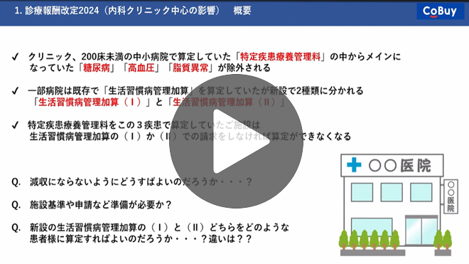 2024年度の改定は、「働き方改革」「医療DX推進」など、運営体制の大きな見直しを伴う変更が多く、今後の医療と介護の連携・調整への影響について注目が集まっています。今回は、クリニックや病院向けにさまざまな増収策をサポートしている株式会社Co-Buyの長瀬顕生氏に、急性期病院における改定に備えて知っておきたいポイントについて伺った。※本動画は改定内容の正式発表前に配信された内容のアーカイブとなります。現時点での実態とは異なる可能性がありますことをご承知おきください。お話を伺った方株式会社Co-Buy 専務取締役長瀬 顕生(ながせ けんしょう)長年、医療機器ディーラーとして医療材料・器械・システムの販売、クリニック開業、病院移転新築計画等の業務に従事。2019年に株式会社Co-Buy専務取締役に就任。 各種セミナーでは診療報酬改定、医療DX、開業支援、などのテーマにて登壇。業種・規模を問わずブランディングを通しての経営安定化、患者様の安心感を提供できる施策、パッケージを提供するため日々、新しい協業企業と出会い、自身も含めブラッシュアップをしている。次回のランチタイム勉強会配信テーマ・視聴予約はこちら前へ診療報酬改定2024(1) 生活習慣病管理加算次へ口コミとの向き合い方