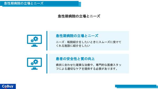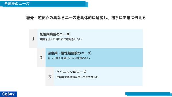 医療機関同士のスムーズな連携は、患者様にとって最適な医療を提供するために欠かせません。しかし、急性期病院・回復期病院・クリニックそれぞれの立場によって抱える課題が異なり、情報共有の不足や転院調整の遅れが医療連携の大きな障壁となっています。本記事では、医療連携の現状と各医療機関のニーズを整理し、患者が適切な医療を受けられる仕組みを構築するための解決策を具体例とともに解説します。 長瀬 顕生(ながせ けんしょう) 株式会社Co-Buy 専務取締役 長年、医療機器ディーラーとして医療材料・器械・システムの販売、クリニック開業、病院移転新築計画等の業務に従事。2019年に株式会社Co-Buy専務取締役に就任。 各種セミナーでは診療報酬改定、医療DX、開業支援、などのテーマにて登壇。業種・規模を問わずブランディングを通しての経営安定化、患者様の安心感を提供できる施策、パッケージを提供するため日々、新しい協業企業と出会い、自身も含めブラッシュアップをしている。 医療連携の円滑化とは?連携の現状と課題 今回は「医療連携の円滑化」というテーマでお話しさせていただきます。医療機関同士の連携がスムーズに進むことで、患者様にとってより良い医療提供が可能になります。しかし、現実には多くの課題があり、改善の余地が大きい分野でもあります。本日はその課題と解決策について、実際の現場での経験を交えながら解説していきます。 医療連携とは? まず「医療連携」と一口に言っても、その形態は様々です。代表的なものとして以下の3つが挙げられます。 病診連携(病院と診療所の連携) 病病連携(病院同士の連携) 紹介・逆紹介(患者様の移動を円滑にする仕組み) 医療機関にはそれぞれ役割があり、急性期病院・回復期病院・慢性期病院・クリニックといった形で機能が分かれています。そのため、患者様の状態に応じて適切な医療機関へつなげることが必要ですが、これがスムーズにいかないことが多いのが現状です。 医療機関ごとのニーズ では、医療連携において各施設はどのような課題を抱えているのでしょうか。それぞれの立場から見ていきましょう。 1. 急性期病院のニーズ 急性期病院の主な機能は、高度な治療や手術、救急対応です。特に、「手術・入院の稼働率を高めること」が経営上の大きな課題となっています。そのため、患者様の状態が落ち着いたら、速やかに転院先を決めることが求められます。しかし、転院の調整には以下のような問題が発生しやすいのが現状です。 転院先がすぐに見つからない → ベッドが埋まり、受け入れができないケースが多い 病院外来の負担が大きい → 入院患者が増えすぎると、外来対応が逼迫する 紹介・逆紹介の流れが確立されていない → 他院やクリニックとの関係性が希薄だと、連携が滞る また、医療機器やオペ室の設備投資には莫大なコストがかかるため、高度な治療が必要な患者様にリソースを集中させることが重要です。そこで、回復期や慢性期病院と円滑に連携し、効率的な流れを作ることが急務となります。 次回のランチタイム勉強会配信テーマ・視聴予約はこちら