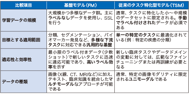 従来のタスク特化型モデル(Task Specific Model;TSM)は、特定の疾患名だけを完璧に知っている専門医のようなものである。専門分野外の領域(例:放射線画像 vs. 眼科画像)については全く知識を持たず、訓練された範囲外のデータには対応できない。それに対して、FMとは膨大な量の広範なデータを用いてタスク非依存的な方法で事前学習され、多岐にわたる下流タスクに対応可能な汎用AIモデルのことである。