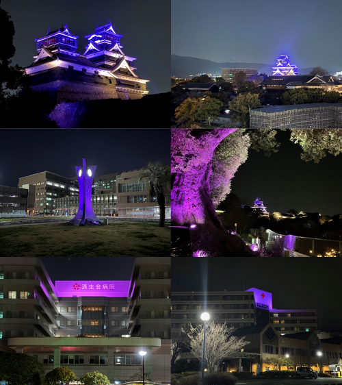 「パープルデー」とは、毎年3月26日に行われている世界的なてんかん啓発の日で、シンボルカラーが紫であることに由来する。てんかんは人口100人当たり1人前後の患者がいると考えられており、日本の患者数は100万人(世界では5,000万人)以上と推定されている。「パープルデー」には、てんかんを持つ人への応援のメッセージを込めて世界各国の人が「紫色のもの」を身につける。また、皆が楽しみながらてんかんへの理解を深められるよう、講演会や音楽イベントなどのイベントが各地で開催されている。熊本でも昨年(2025年)に引き続き、熊本城、熊本大学病院、熊本医療センター、済生会熊本病院、熊本赤十字病院で紫色でのライトアップが行われた。てんかんと片頭痛は合併しやすいが、治療目標を発作フリーとするてんかんと同様に、片頭痛も発作フリーあるいは最適コントロールを目指すことが国際頭痛学会で決まった。
