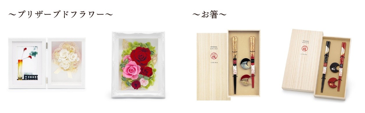 画像 : https://newscast.jp/attachments/0uRYsvsY9o2JgsnIJW8K.jpgプリザーブドフラワー:「フォトフレーム コンチェルト グロッソ」「セレナータ ルネッサンスフレーム」/お箸:「瑞雲&箸置暁月2P」「宵待月 & 箸置華桜2P」