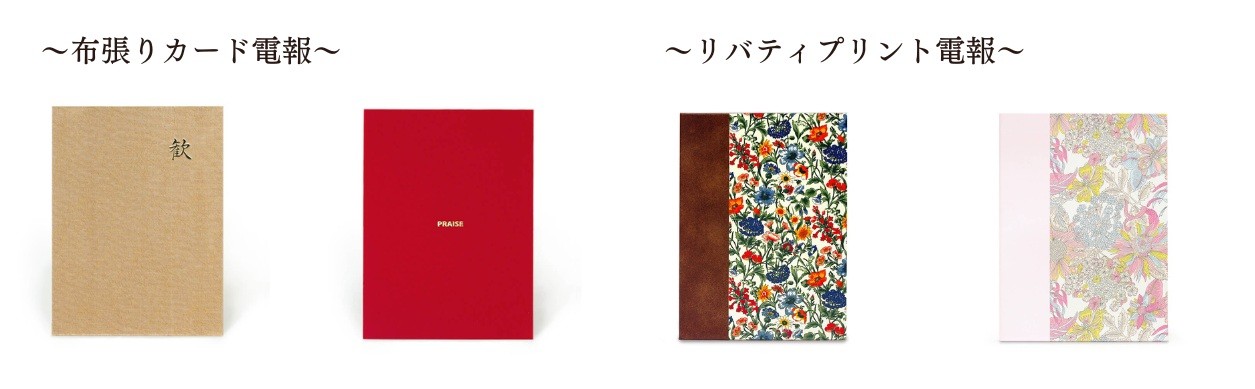 上質な布地を使用した「布張りカード電報」や、華やかさと品を兼ね備えた「リバティプリント電報」は、家族や恩師、先輩・上司など、特に親しい相手への受章祝いにもおすすめです。 落ち着いた優雅さがあり、受け取る方のイメージや関係性に合わせてお選びいただけます。