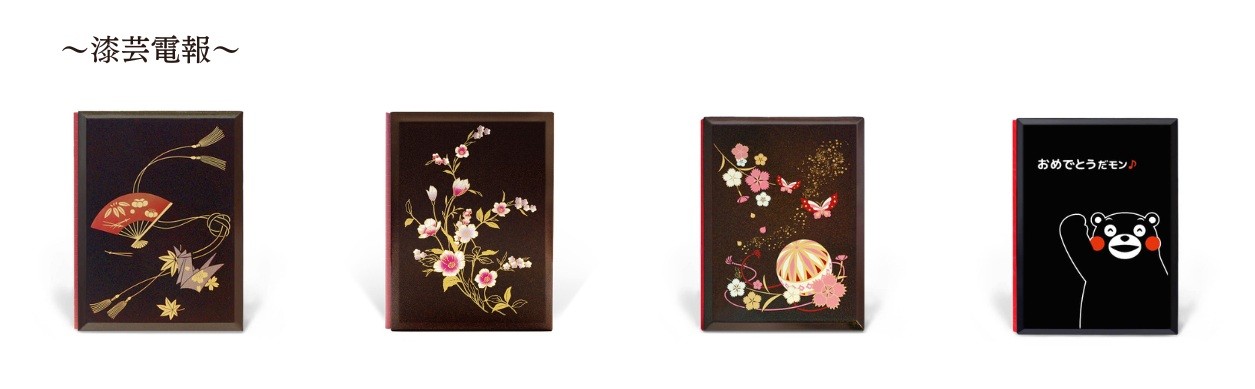 画像 : https://newscast.jp/attachments/E6MxL23D5f3JvhBCfXtx.jpg漆芸電報:「寿ぎ(ことほぎ)」「フリージア ~親愛~」「なでしこ」「くまモンの電報(おめでとうver)」