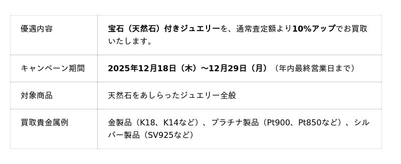 宝石(天然石)付きジュエリーを、キャンペーン期間中は一律10%アップで買い取りを強化。眠っているお品物の価値を見つめ直す絶好の機会を提供します。