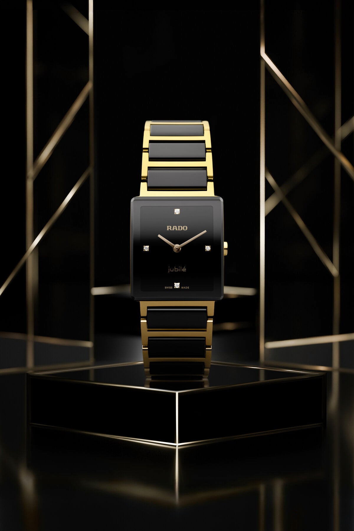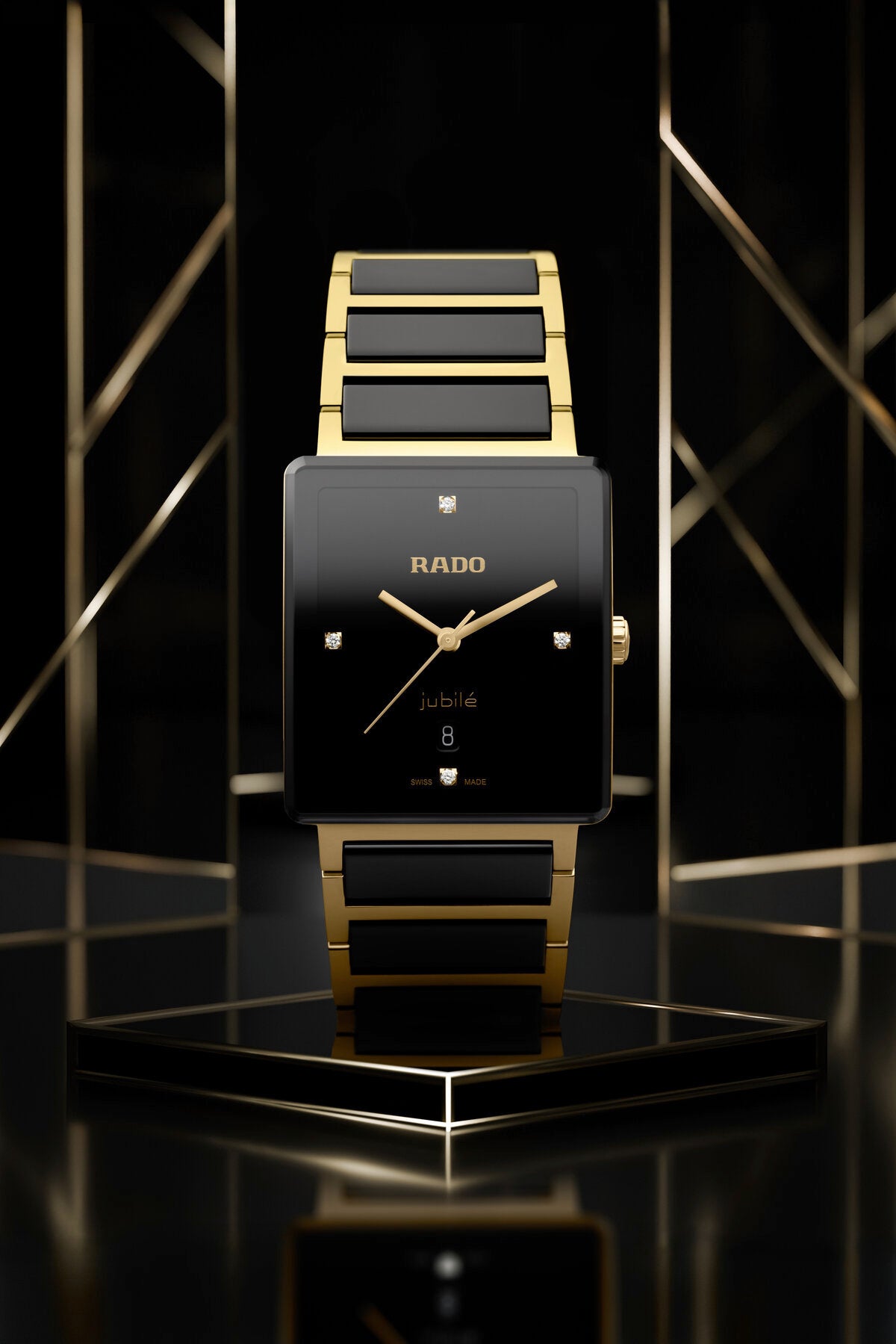 ブラック、イエローゴールドプリントのRadoおよびJubileのロゴ